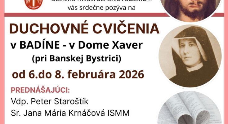 Srdečne vás pozývame na trojdňové duchovné cvičenia v termíne od 6. do 8. februára v Dome Xaver v Badíne. Exercície vedie vdp. Peter Staroštík a sr. Jana Mária Krnáčová ISMM z našej košickej komunity. Téma duchovných cvičení znie: Modlitba troch slov: Ježišu, dôverujem ti!