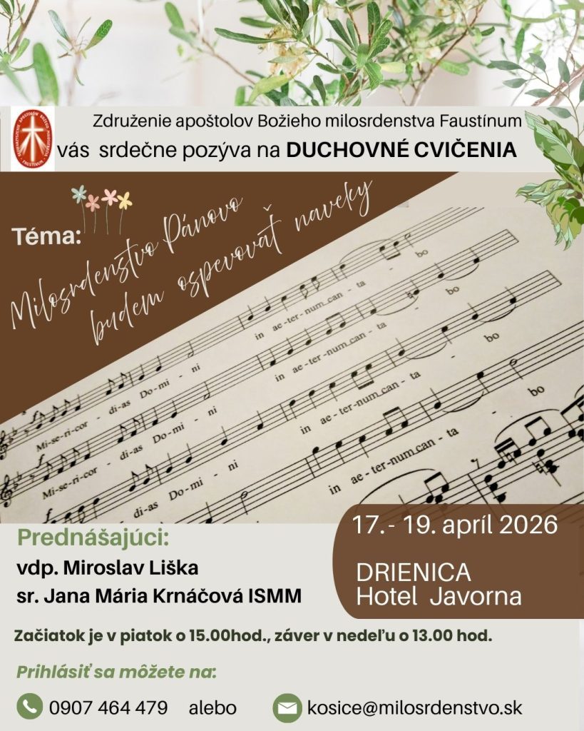 Všetkých ctiteľov Božieho milosrdenstva a sv. sestry Faustíny srdečne pozývame na duchovné cvičenia, ktoré sa uskutočnia od 17. do 19. apríla v Drienici pri Sabinove (hotel Javorna). Veľkonočné exercície na tému: Milosrdenstvo Pánovo budem ospevovať naveky (žalm 89.) pre vás pripravili vdp. Miroslav Liška a sr. Jana Mária Krnáčová ISMM. Začiatok je v piatok o 15.00 hod. a záver v nedeľu o 13.00 hod.